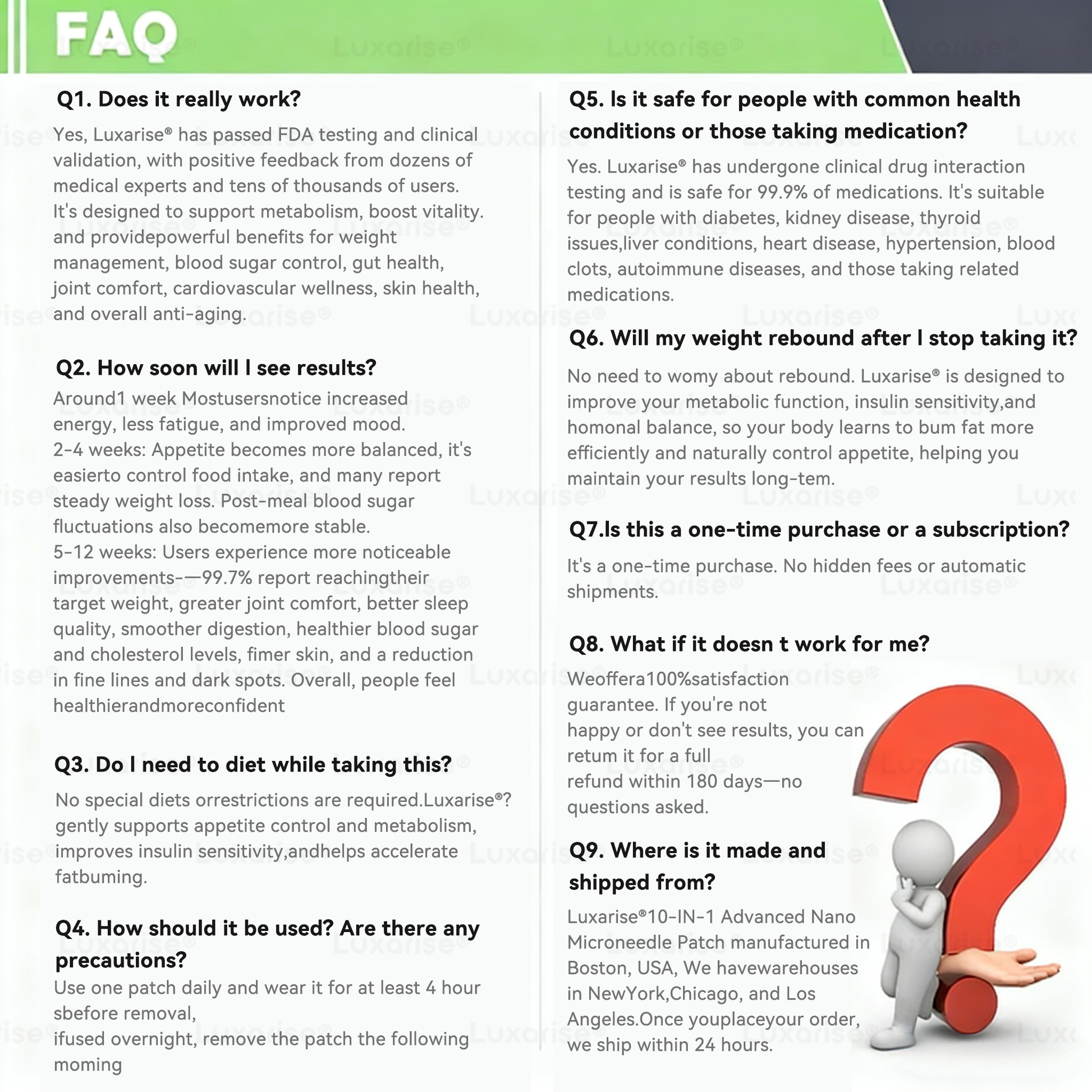 Over 2,000 users have reported noticing weight loss and increased energy levels within approximately one week of using Luxariseยฎ. Clinical trials show that after 30 days of continuous use, up to 96% of participants experienced improved metabolism, reduced stubborn fat, and noticeable weight loss. Results may vary depending on individual body types and lifestyles, but most users see significant changes within 1โ2 weeks.